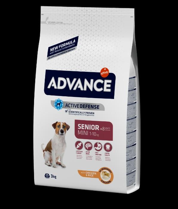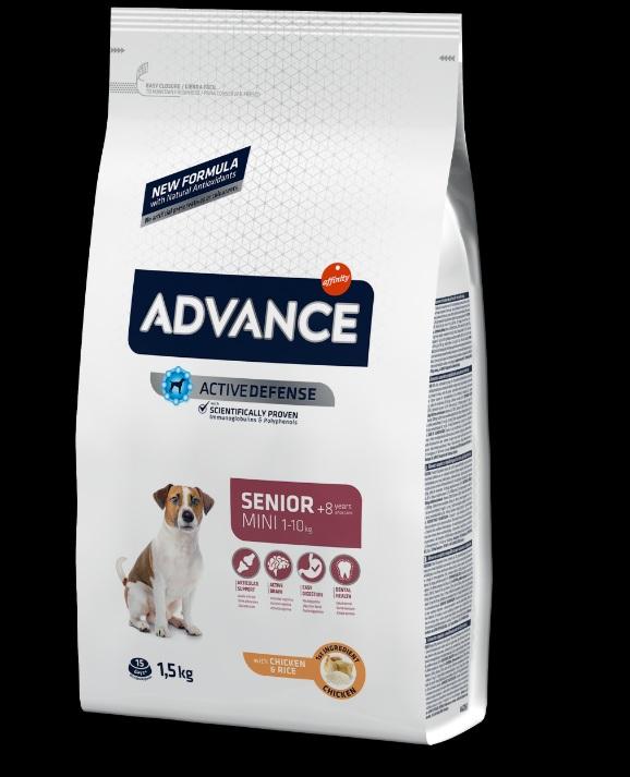 Los perros senior de raza pequeña necesitan un alimento específico que se adapte a su necesidades nutricionales. ADVANCE Senior Mini es un alimento de alta gama fácil de digerir formulado para cubrir sus necesidades específicas que refuerza sus defensas y barreras naturales. Gracias a su fórmula exclusiva Advance ayuda a preservar la salud articular, la masa muscular, la salud intestinal, la salud dental y a preservar la actividad cognitiva. Además, ADVANCE Senior Mini contiene taurina, un aminoácido que contribuye al buen funcionamiento del corazón